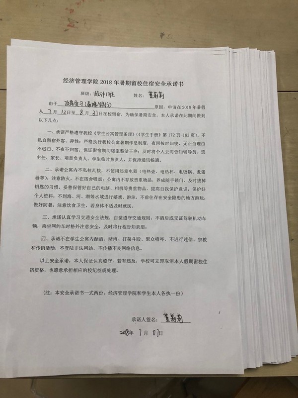 最后,所有暑期留校住宿学生签订并上交《经济管理学院2018年暑期留校住宿安全承诺书》。