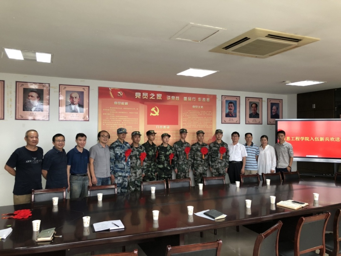 信息工程学院院长余建军结合汶川地震解放军救援抢险动人事列,向7位同学阐明作为一名解放军应有的责任与义务,勉励入伍同学携笔从戎,无问东西。信息工程学院党支部书记叶俊希望各位同学作为大学生入伍,能在部队中发挥自己的专长,同时在训练中也要保持学习,提高自身知识水平,为学校争光。我校人武部宁亚和老师向新兵入伍同学们介绍了一些入伍前应该做的一些准备和去部队时应该带的东西。