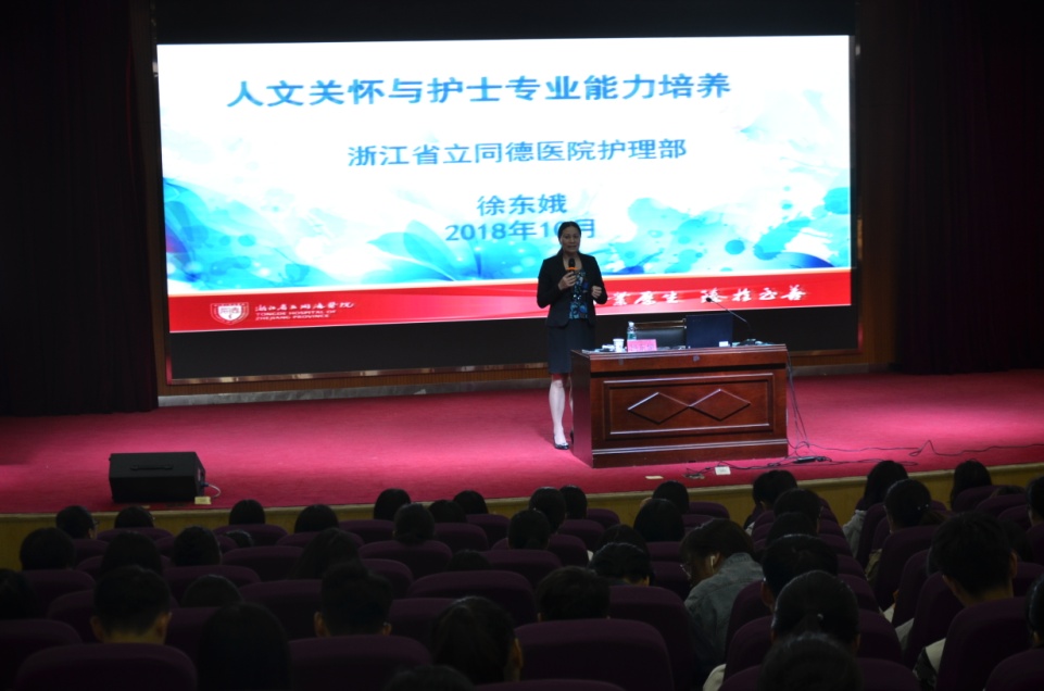 10月31日下午1点半,图书馆1号报告厅座无虚席。浙江省立同德医院护理部主任、硕士生导师徐东娥主任护师受邀为医学院18级护理专业学生作《人文关怀与护士专业能力培养》的专题讲座。
