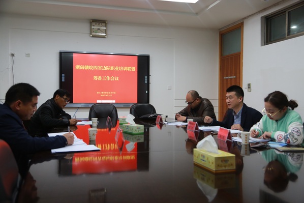 4月11日下午, 浙闽赣皖四省边际职业培训联盟筹备工作会议在我校举行。 来自浙闽赣皖四省的职业院校、人力资源和社会保障部门以及企业等11个单位的21名领导和联络员出席会议,共同商讨联盟成立大会有关事宜。会议由我校继续教育学院院长徐荆主持。