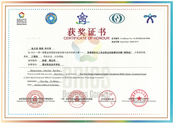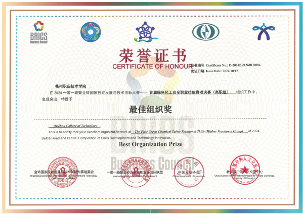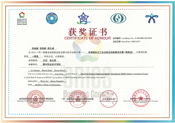 一带一路金砖国家技能发展与技术创新大赛是是由金砖国家工商理事会中方理事会、一带一路暨金砖国家技能发展国际联盟和中国科协一带一路暨金砖国家技能发展与技术创新培训中心主办,旨在通过技能竞赛和技术创新的方式推动技能人才的培养和技术的创新与发展。首届绿色化工安全职业技能赛项围绕化工、安全、职业卫生、环保、应急处置、八大特种作业等知识,紧扣“三大模块”:绿色化工安全理论知识、化工安全生产仿真操作、绿色化工生产装置操作,开展安全综合核心技术和职业素养竞技。该项赛事为我国企业和院校践行“走出去”战略搭建了国际技能发展和技术平台,为金砖国家建立了人才选拔通道,有利于提升人才培养能力;比赛内容紧扣新技术、新工艺适应现代化工产业发展的需求,有助于培养满足现代化工产业发展需要、支撑化工行业高质量可持续发展的复合型、应用型人才。