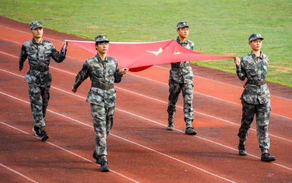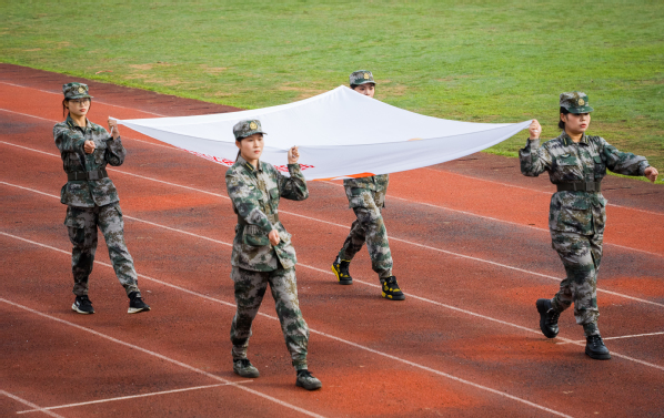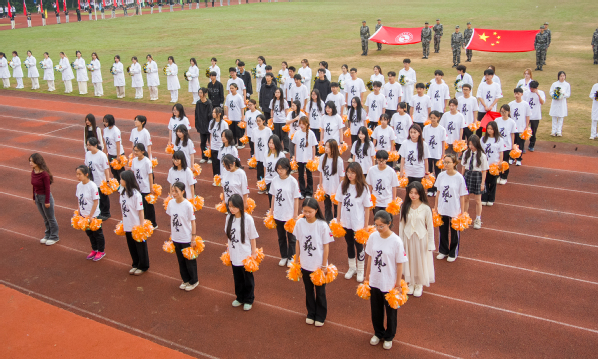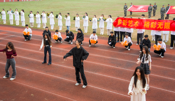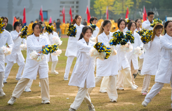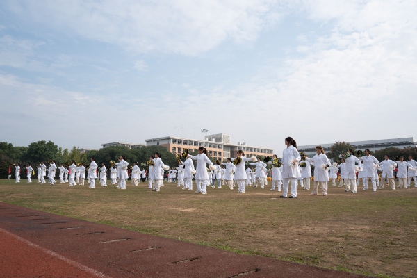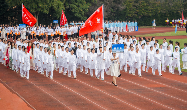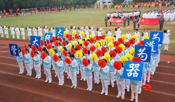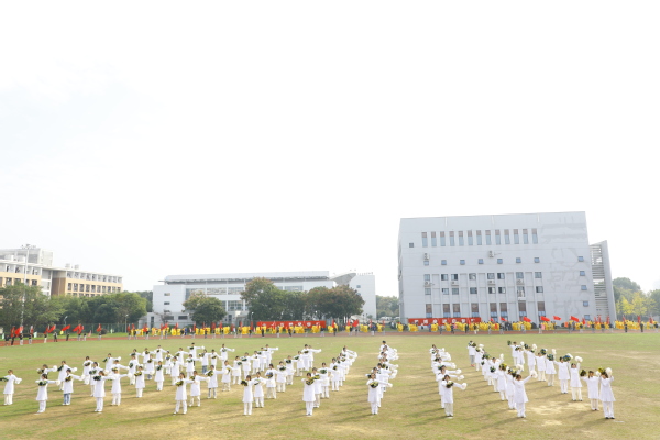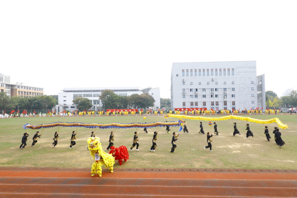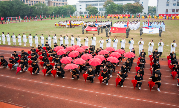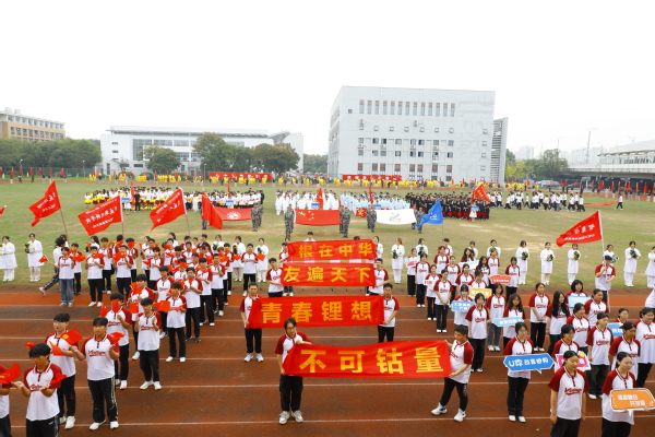 国旗队、校旗队、会旗队、彩球队及各二级学院方阵英姿飒爽地缓缓进入会场,龙狮、啦啦操、功夫扇、歌曲《我和我的祖国》充分展现了衢职院师生积极向上的精神面貌。