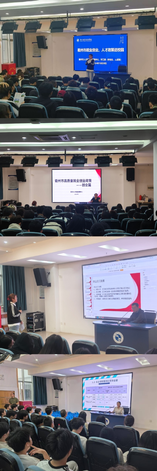 10月下旬至11月初,随着政策进校园活动的开展,衢州市社会保险事业管理中心、衢州市人才和就业管理中心两家政府单位,四个科室,6位专家走进校园,为我们带来了社保政策、人才政策、毕业生补贴政策、就创业政策四大板块的政策宣讲。涉及2025届毕业生代表500余人。